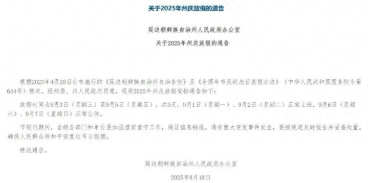 据通告内容显示,根据2023年4月20日公布施行的《延边朝鲜族自治州自治条例》及《全国年节及纪念日放假办法》(中华人民共和国国务院令第644号)规定,2025年州庆放假时间为9月3日(星期三)至9月5日(星期五),共3天。9月1日(星期一)、9月2日(星期二)正常上班,9月6日(星期六)、9月7日(星期日)正常公休。