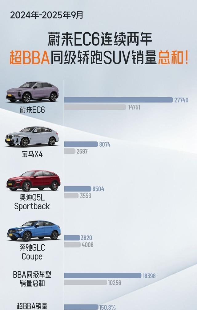 设计之外,销量是产品力最硬核的背书。作为中国首个突破10万交付大关的纯电轿跑SUV,EC6连续五年销量力压BBA同级单一车型:2024年销量达27740台,2025年1-9月交付14751台,2023-2024年更是连续两年以150.8%、143.8%的超越比例,将三款BBA同级车型的销量总和甩在身后。这一成绩不仅打破了BBA"轿跑SUV天生小众"的借口,更证明了只要精准击中用户需求,高端纯电车型完全能实现销量突围。